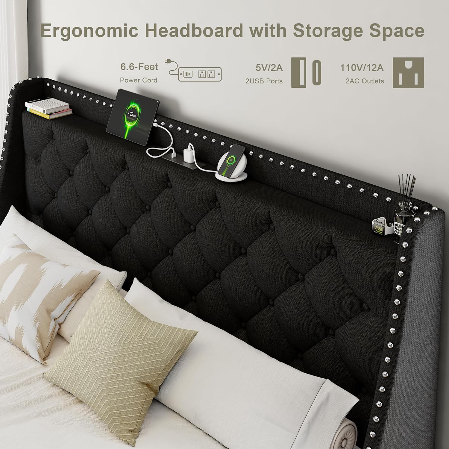 Feonase King Size Bed Frame with Luxury Wingback and Fast Charging Station,Upholstered Button Tufted Storage Headboard Platform Bed,Sturdy Wooden Slats Support,Noise-Free,Easy Assembly,Matte Black